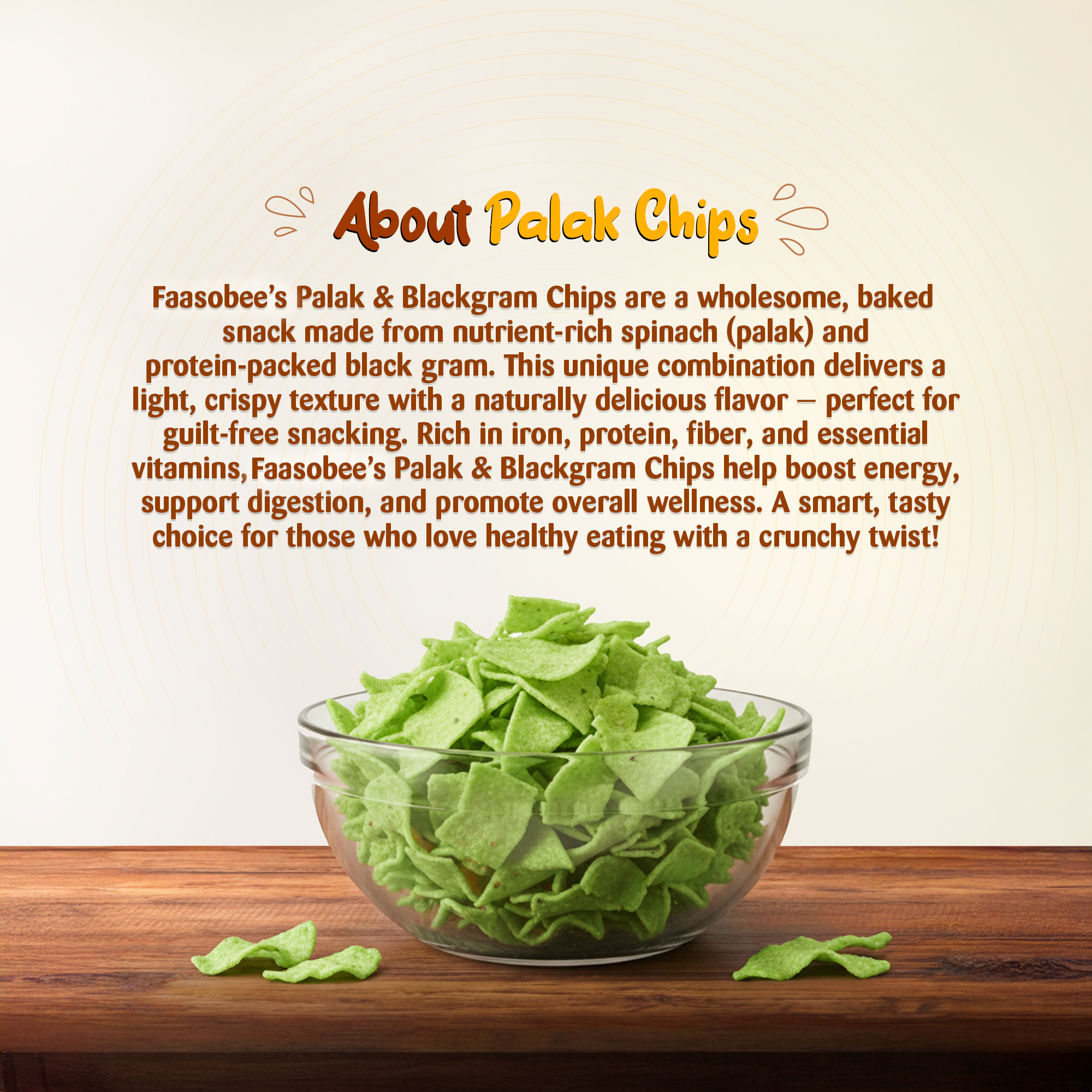 Faaso Bee’s Palak & Blackgram Chips offer a nutritious blend of urad dal and fresh spinach that’s baked—not fried—for wholesome taste and a satisfying crunch. Crafted with real palak powder and free from onion and garlic, these chips are perfect for healthy snacking and festive occasions.