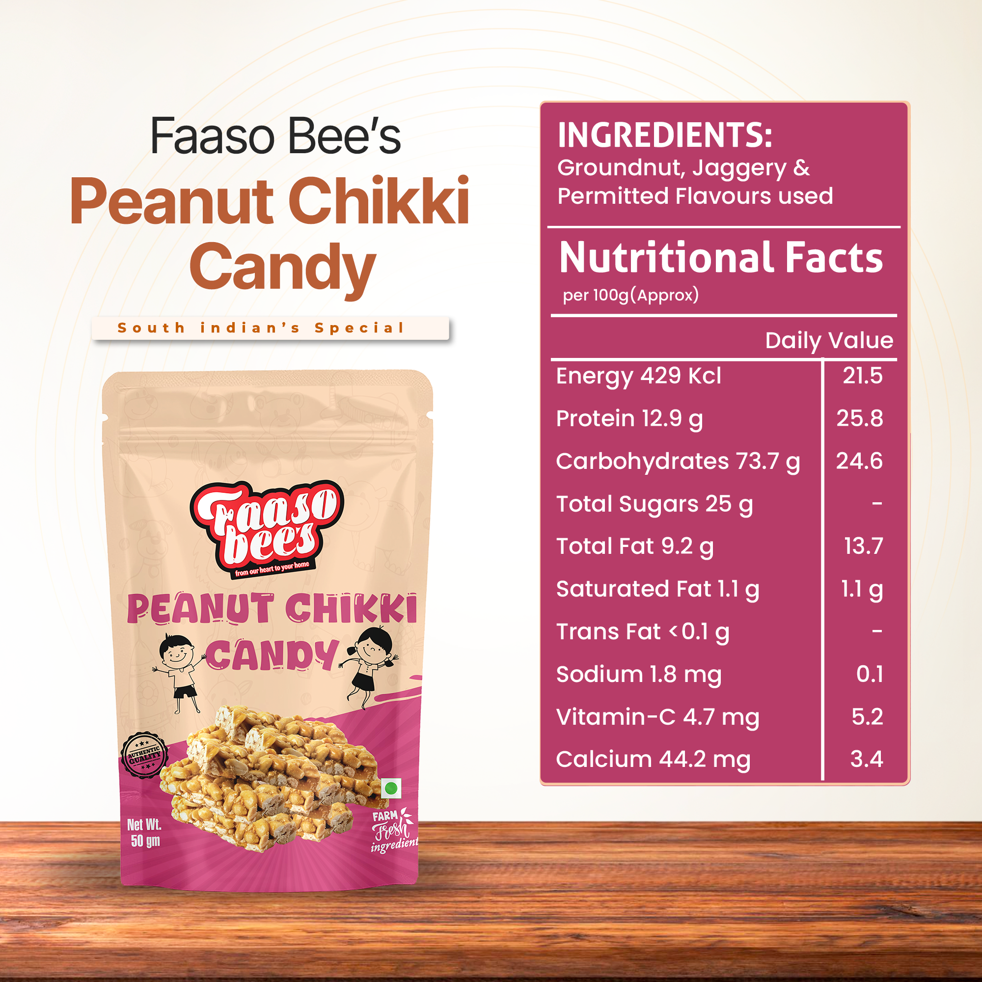 Faaso Bee’s Peanut Chikki Candy blends selected groundnuts and jaggery to create a natural, crunchy and energy-rich sweet.