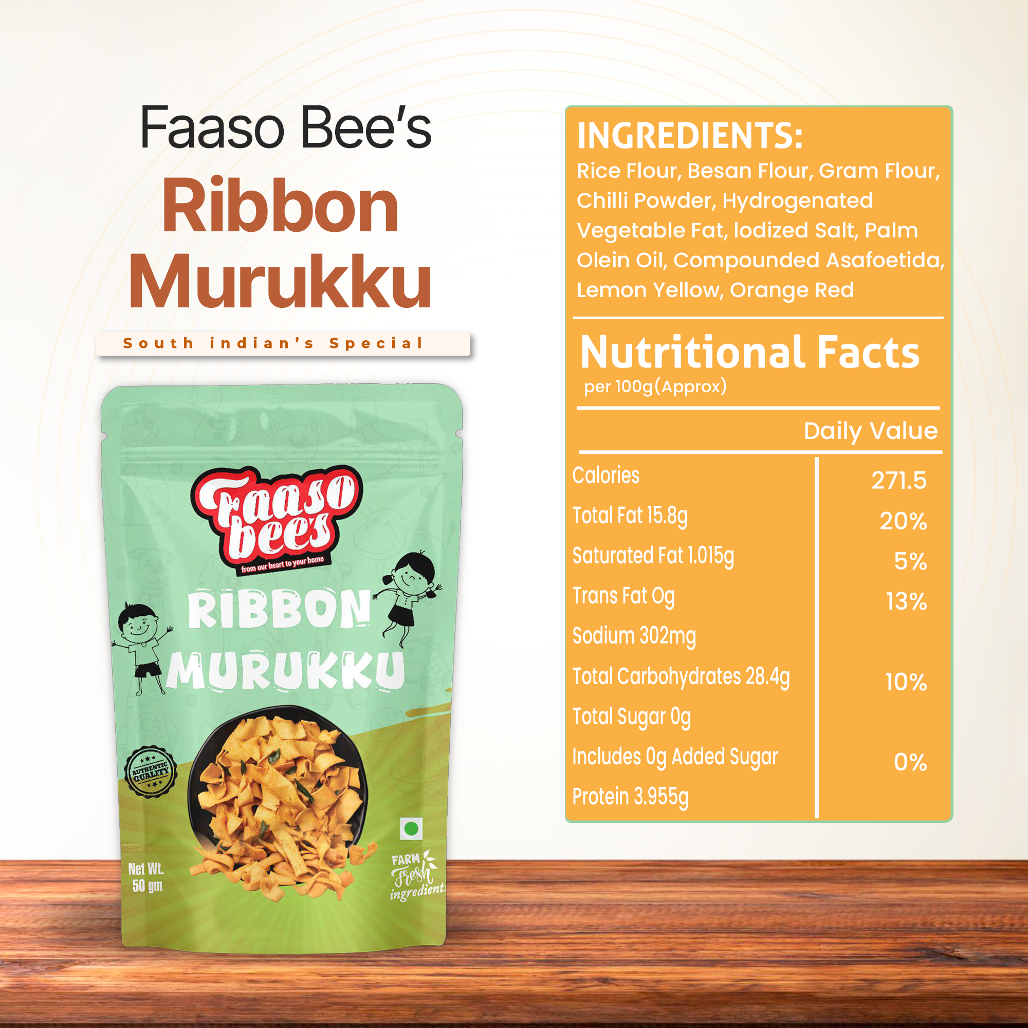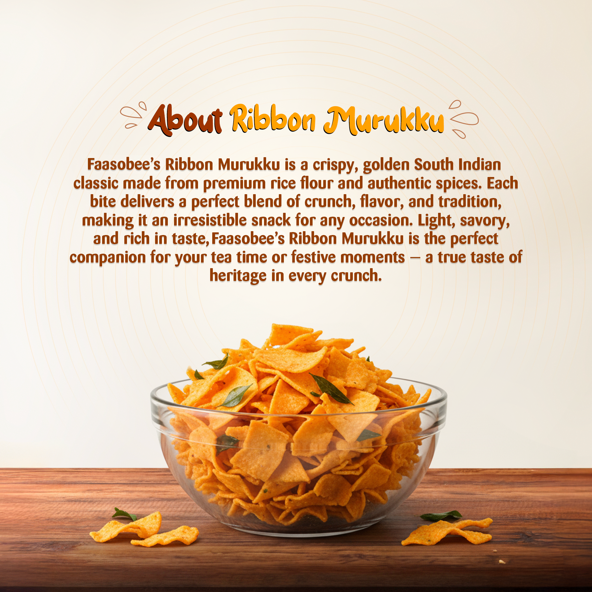 Faaso Bee’s Ribbon Murukku is prepared using rice flour, besan and mild spices, deep-fried for authentic crunch and flavour.